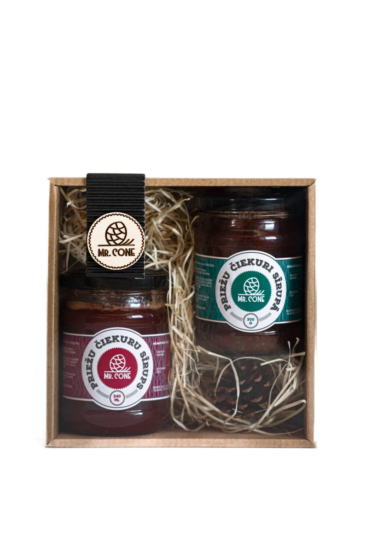 Priežu čiekuru sīrupu dāvanu komplekts.